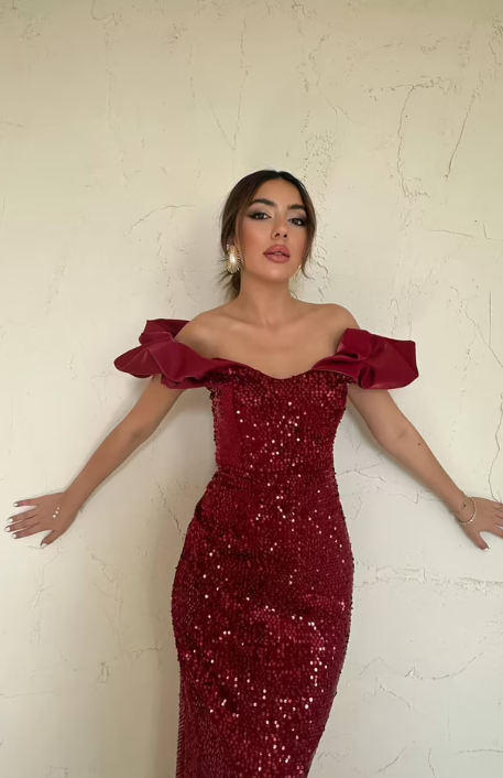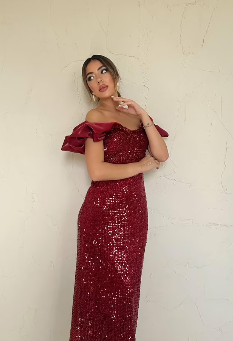 Das Midnight Ruffle Sequin Dress bringt Glamour auf höchstem Niveau – perfekt für unvergessliche Abende. Das figurbetonte Kleid besteht aus 95 % Polyester und 5 % Elastan, wodurch es sich elegant an die Silhouette schmiegt, ohne an Komfort zu verlieren. Die aufwendig verarbeiteten Pailletten sorgen für einen luxuriösen Schimmer bei jeder Bewegung. Die dramatischen Rüschen-Details an den Schultern verleihen dem Design einen Couture-Charakter – auffällig, edel und kompromisslos elegant.