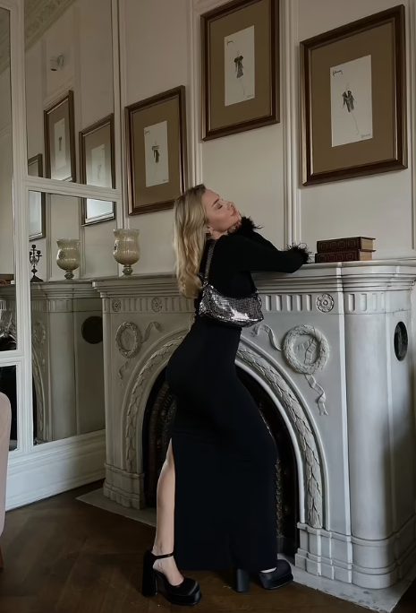 Das Noir Feather Elegance Dress verkörpert pure Raffinesse und feminine Extravaganz. Gefertigt aus einem hochwertigen Stretchstoff (95% Polyester, 5% Elastan), schmiegt sich das Kleid elegant an die Figur an und betont jede Silhouette. Die Feder-Details an den Ärmeln verleihen dem Look einen luxuriösen Touch – perfekt für elegante Dinner, Partynächte oder exklusive Events. Ein schwarzes Statement-Kleid, das zeitlose Klasse mit moderner Sinnlichkeit verbindet.