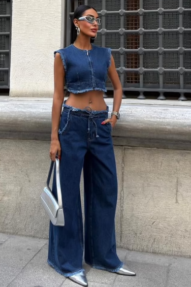 Das ärmellose Croptop mit rohem Saumdesign und die weit geschnittene Jeanshose schaffen einen selbstbewussten Look, der sowohl lässig als auch edgy wirkt.